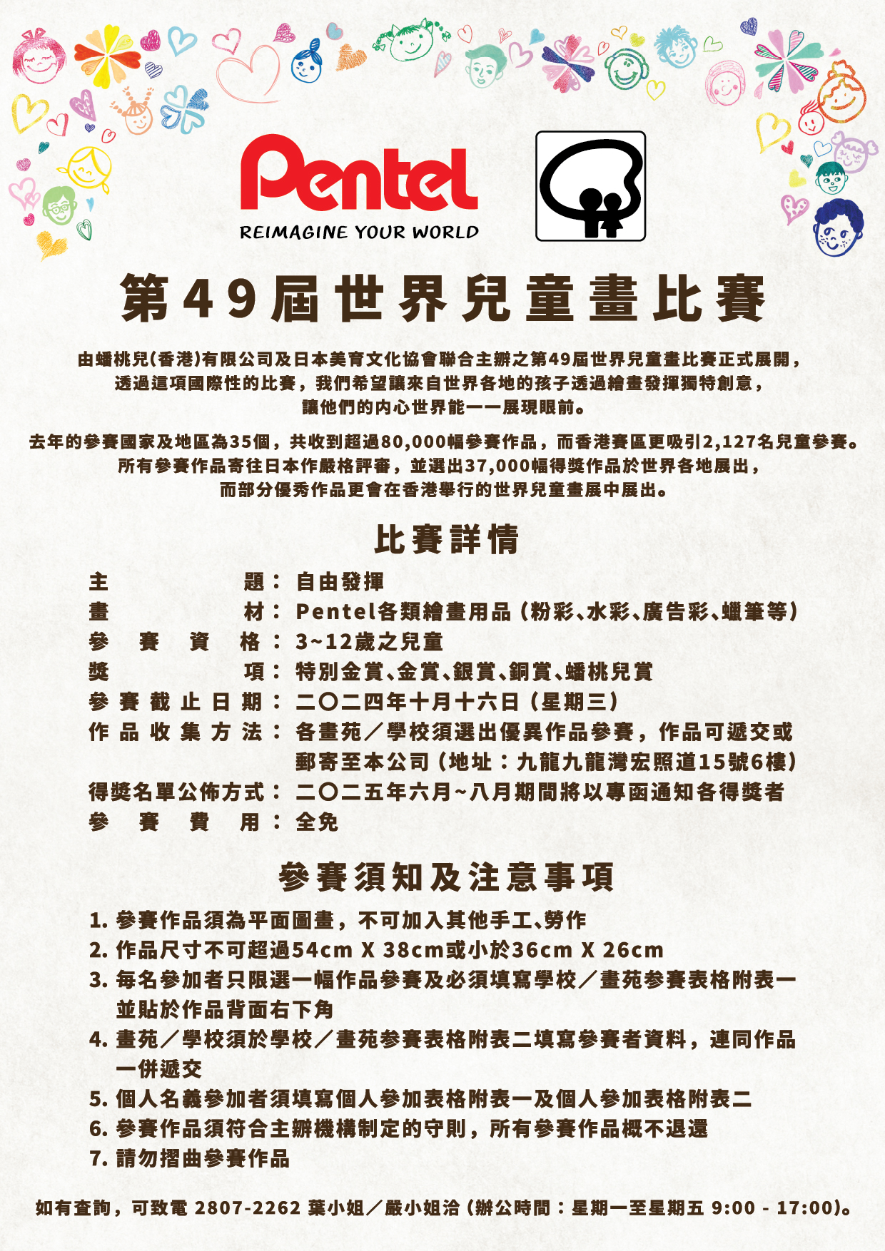 第49屆世界兒童畫比賽參加詳情 2024/06/26 活動 *第48屆世界兒童畫比賽之得獎通知信預計於2024年7月下旬寄出, 第48屆世界兒童畫比賽展覽之詳情將儘快公布。 第49屆世界兒童畫比賽-比賽詳情 第49屆世界兒童畫比賽-比賽詳情 學校/畫苑参賽附表一 學校/畫苑参賽附表一 學校/畫苑参賽附表二 學校/畫苑参賽附表二 個人参賽附表一 個人参賽附表一 個人参賽附表二 個人参賽附表二