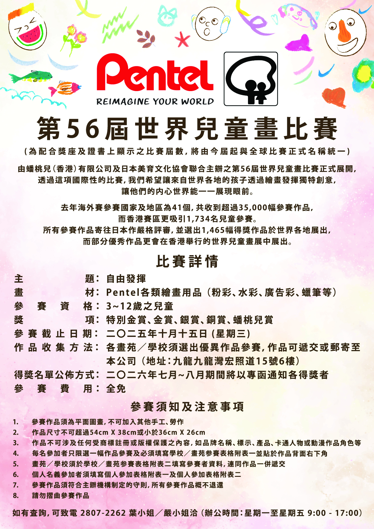 第56屆世界兒童畫比賽參加詳情 2025/07/31 活動 * 為配合獎座及證書上顯示之比賽屆數,將由今屆起與全球比賽正式名稱統一為「第56屆世界兒童畫比賽」* 學校/畫苑参賽附表一 學校/畫苑参賽附表一 學校/畫苑参賽附表二 學校/畫苑参賽附表二 個人参賽附表一 個人参賽附表一 個人参賽附表二 個人参賽附表二 第56屆世界兒童畫比賽-比賽詳情 第56屆世界兒童畫比賽-比賽詳情